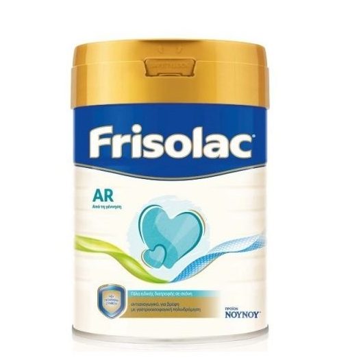Frisolac AR Το Frisolac AR είναι ένα γάλα για την αντιμετώπιση των αναγωγών στα βρέφη, με προηγμένη σύνθεση. Περιέχει σαν πηκτικό παράγοντα, διαλυτό σε νερό, κόμμι χαρουπιού. Μέρος της πρωτεΐνης είναι μερικός υδρολυμένη ορολευκωματίνη. Τα ανώτερο χαρακτηριστικά καθιστούν το Frisolac AR αποτελεσματική επιλογή για την αντιμετώπιση της χωρίς επιπλοκές, γαστροοισοφαγικής παλινδρόμησης στα βρέφη. Το Frisolac AR περιέχει όλες τις απαραίτητες βιταμίνες, ιχνοστοιχεία και λιπαρά οξέα για την υγιή ανάπτυξη των βρεφών και καλύπτει τις ειδικές διατροφικές ανάγκες. Για βρέφη άν των 6 μηνών αποτελεί μέρος μεικτής διατροφής. Διάρκεια ζωής : 24 μήνες