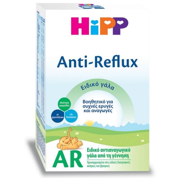 Anti Reflux AR Ειδικό Αντιαναγωγικό Γάλα Νέα Φόρμουλα βρεφικού γάλακτος** Με ιδιαίτερα κρεμώδη υφή Με χαρουπάλευρο, πολύτιμο φυσικό πηκτικό μέσο με εδώδιμες ίνες, συμβάλλει στην καλύτερη διατήρηση της τροφής στο στομάχι Με όλα τα σημαντικά θρεπτικά συστατικά για την υγιή ανάπτυξη του μωρού σας Mε φυσικές καλλιέργειες γαλακτικού οξέως ( Lb Fermentum) που αρχικά λαμβάνονται από το μητρικό γάλα. Το μητρικό γάλα περιέχει ένα μεγάλο αριθμό φυσικών καλλιεργειών, οι οποίες μπορεί να διαφέρουν μεταξύ τους Το ειδικό αντιαναγωγικό γάλα HiPP AR βοηθά στις περιπτώσεις συχνών ερυγών και αναγωγών. Με αυτόν τον τρόπο μειώνεται η παλινδρόμηση της τροφής στον οισοφάγο (Reflux) και η συνακόλουθη ερυγή και αναγωγή Οι τροφές AR πρέπει να χρησιμοποιούνται μόνο σε συνεννόηση με τον παιδίατρο ΣΥΣΚΕΥΑΣΙΑ : 500gr