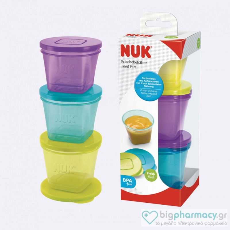 Τα δοχεία συντήρησης NUK Fresh Foods είναι ιδανικά για να τα γεμίζετε με φρεσκομαγειρεμένο χυλό, τον οποίον μπορείτε αμέσως μετά να συντηρήσετε στο ψυγείο ή και να τον καταψύξετε. Τα δοχεία μπορούν να τοποθετηθούν το ένα επάνω στο άλλο και έτσι να εξοικονομήσετε πολύτιμο χώρο. Τα δοχεία έχουν στρογγυλό σχήμα και διατίθενται σε μέγεθος 65ml, 75ml και 85ml αντίστοιχα. Κάθε συσκευασία περιέχει 2 δοχεία από το αντίστοιχο μέγεθος. Με αυτόν τον τρόπο έχετε πάντα ένα φρέσκο γεύμα έτοιμο για το παιδί σας!