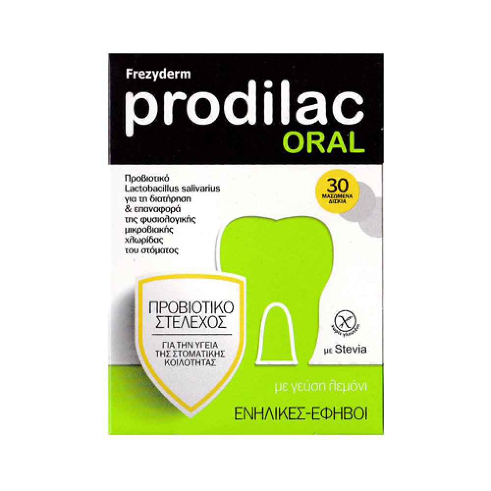 Προβιοτικά και στοματική υγεία Ενήλικες Frezyderm Prodilac Oral Συμπλήρωμα διατροφής με προβιοτικό στέλεχος Lactobacillus salivarius Oral S1Βιταμίνη D3 για τη διατήρηση και επαναφορά της φυσιολογικής μικροβιακής χλωρίδας του στόματος και τη διατήρηση της φυσιολογικής οδοντοστοιχίας. 30 μασώμενες παστίλιες.Με γεύση λεμόνι.