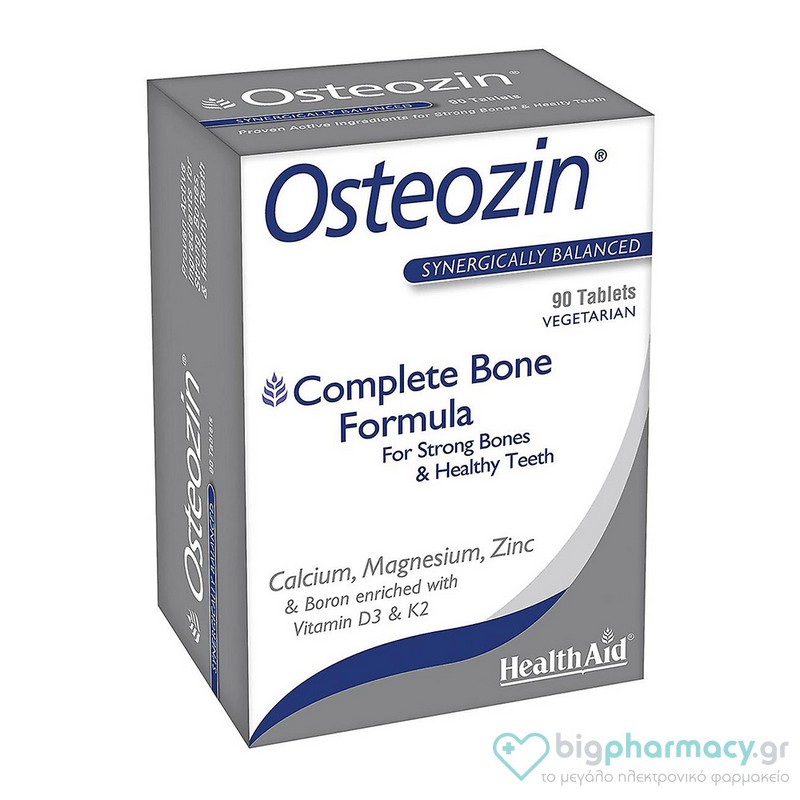 Τα οστά είναι ένας ζωντανός ιστός που συνεχώς δημιουργείται αλλά και καταστρέφεται. Όταν μειώνεται η πυκνότητα των οστών υπάρχει κίνδυνος για οστεοπενία και οστεοπόρωση. Για την πρόληψη και τη διατήρηση της φυσιολογικής κατάστασης των οστών, απαιτείται ασβέστιο ως βασικό συστατικό τους και μαγνήσιο, που είναι απαραίτητο για το μεταβολισμό του ασβεστίου και την υποστήριξη των μυών. Ο ψευδάργυρος συμμετέχει στη σύνθεση του DNA για την παραγωγή πρωτεϊνών που χρειάζονται για το σχηματισμό του οστού. Το βόριο εμποδίζει την απώλεια του ασβεστίου και οι βιταμίνες D3 & Κ2 είναι καθοριστικές για την απορρόφηση και την αξιοποίηση του ασβεστίου.Το Osteozin της HealthAid είναι ένας εξειδικευμένος συνδυασμός με όλα τα απαραίτητα συστατικά, τα οποία δρουν συνεργιστικά για τη μέγιστη υποστήριξη της υγείας των οστών, τη διατήρηση υγιών επιπέδων του ασβεστίου, τη μείωση απώλειας οστικής μάζας και την εύρυθμη λειτουργία του μυϊκού συστήματος. Ιδανικό για ηλικιωμένους, αθλητές σε μετατραυματικές καταστάσεις (κατάγματα) και γυναίκες ιδιαίτερα στην περίοδο της εμμηνόπαυσης. Κάθε ταμπλέτα περιέχει : Calcium (as calcium citrate,carbonate) 185mg Magnesium (as citrate,oxide) 118mg Zinc (as citrate) 5mg Vitamin D3( as cholecalciferol) 5mg Vitamin K2 (as menaquinone-7) 25mg Boron (as sodium borate) 1mg ΔΟΣΟΛΟΓΙΑ Eνήλικες και παιδιά άνω ωτν 12 ετών, 3 ταμπλέτες ημερησίως με το πρωινό. Δεν περιέχει γλουτένη, σιτηρά, σόγια, γαλακτοκομικά, λακτόζη, ζελατίνη, GMO, τεχνητά χρώματα, συντηρητικά ή βελτιωτικά γεύσηςΣΥΣΚΕΥΑΣΙΑ90 ταμπλέτες, σε blister