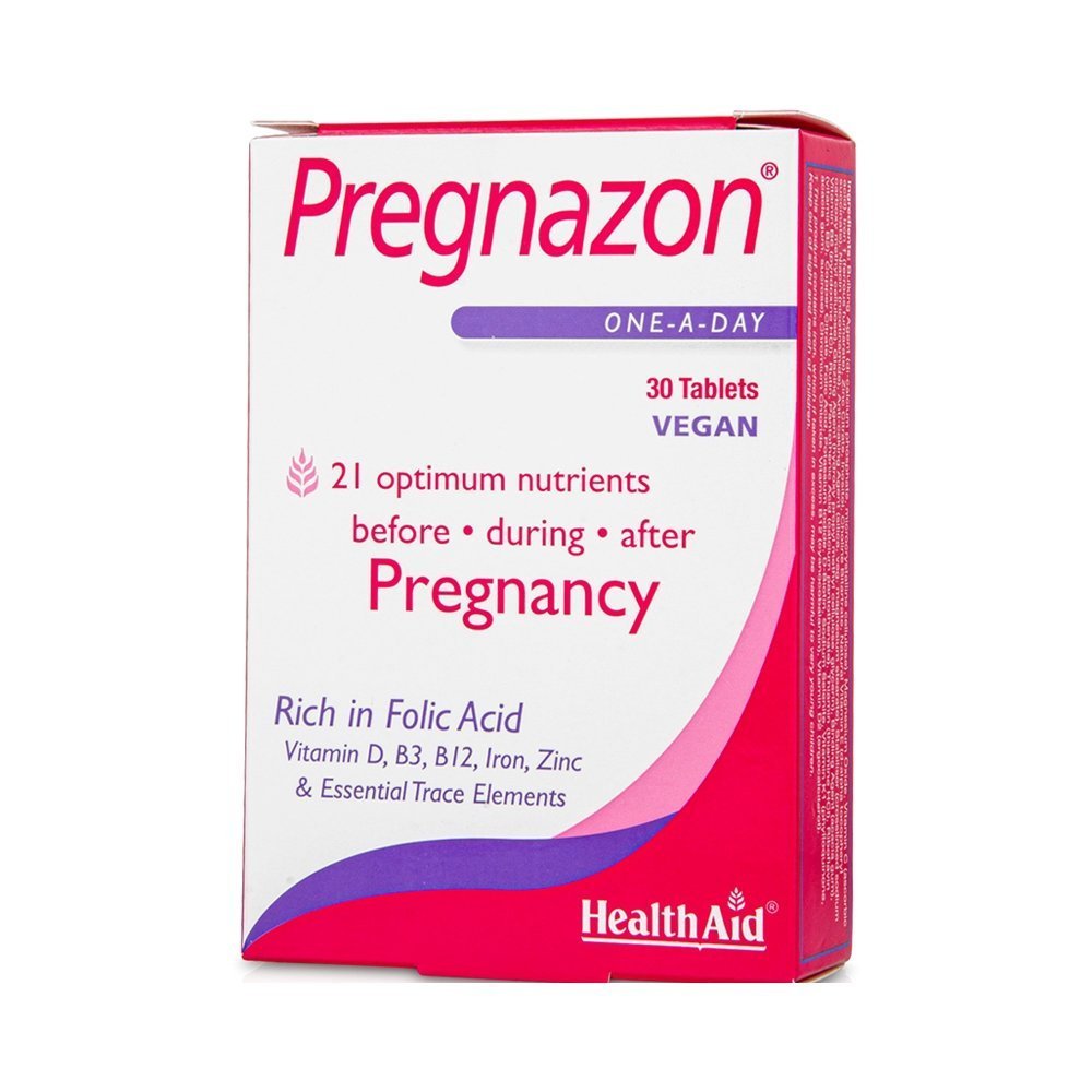 Η εποχή με τις μεγαλύτερες απαιτήσεις διατροφικά για την υγεία μιας γυναίκας είναι στην περίοδο προσπάθειας σύλληψης, όταν είναι έγκυος και όταν θηλάζει. Αυτό που χρειάζεται είναι επαρκείς ποσότητες φολικού οξέως το οποίο συμβάλλει στη σωστή ανάπτυξη του μητρικού ιστού κατά την εγκυμοσύνη, του νευρικού σωλήνα αλλά και του εγκεφάλου το εμβρύου. Πολύ σημαντική είναι η ινοσιτόλη για την ομαλοποίηση των γυναικείων ορμονών καθώς και η βιταμίνη B12 για την κυτταρική διαίρεση και τη φυσιολογική δημιουργία των ερυθρών αιμοσφαιρίων. Ευεργετικό ρόλο παίζει ο σίδηρος με τη βιταμίνη C για την υγιή διανοητική ανάπτυξη, ενώ ο ψευδάργυρος συντελεί στη φυσιολογική σύνθεση του DNA.To Pregnazon της HealthAid είναι μία ισορροπημένη φόρμουλα με φολικό οξύ, ινοσιτόλη και 20 ακόμα συστατικά που προσφέρουν τη μέγιστη διατροφική υποστήριξη σε περιόδους προσπάθειας σύλληψης, κατά τη διάρκεια της εγκυμοσύνης, μέχρι και το στάδιο του θηλασμού. Κάθε ταμπλέτα περιέχει: Vitamin D (400iu) 10μg Vitamin E (37iu) 25mg Vitamin C 75mg Thiamin (Vitamin B1) 4mg Riboflavin (Vitamin B2) 3mg Niacin (Vitamin B3) 20mg Vitamin B6 10mg Folic Acid 400μg Vitamin B12 6μg Biotin 150μg Pantothenic acid 6mg Vitamin K 75μg Iron 20mg Magnesium 100mg Zinc 15mg Iodine 150μg Copper 1mg Selenium 35μg Rutin 10mg Inositol 25mg Choline 10mg Lutein 275μg ΔΟΣΟΛΟΓΙΑ 1 ταμπλέτα ημερησίως, με το κυρίως γεύμα. Να λαμβάνεται μόνο με γεμάτο στομάχι. • Κατάλληλο για φυτοφάγους και αυστηρά χορτοφάγους(vegans).• Δεν περιέχει μαγιά, γλουτένη, σιτηρά, σόγια, γαλακτοκομικά, αλάτι, χρωστικές, συντηρητικά ή βελτιωτικά γεύσης.ΣΥΣΚΕΥΑΣΙΑ30 ταμπλέτες, σε καρτέλες (blister)