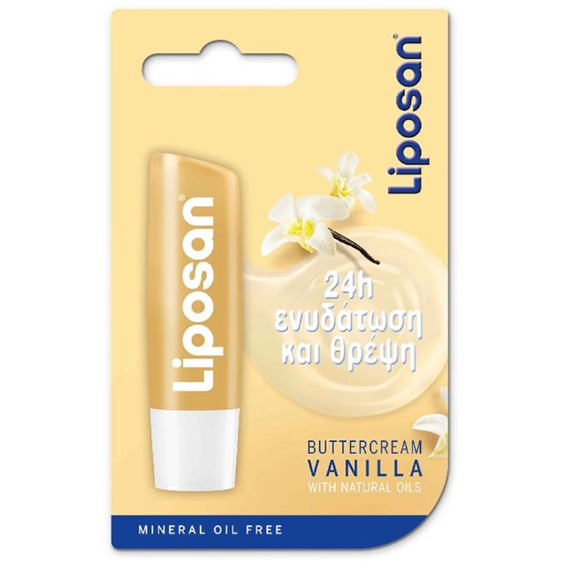 Το Liposan Buttercream Vanilla Lip Balm προσφέρει στα χείλη σας το γλυκό άρωμα της βανίλιας buttercream. Η μοναδική σύνθεση έχει μια ευχάριστα απαλή υφή που λιώνει αμέσως στα χείλη σας, διατηρώντας τα ενυδατωμένα για 24 ώρες *. Η σύνθεση με φυσικά έλαια είναι εντελώς απαλλαγμένη από mineral oils. Απολαύστε φυσική, υγιή εμφάνιση και υπέροχα απαλά χείλη! Η συμβατότητα με την επιδερμίδα των χειλιών είναι δερματολογικά εγκεκριμένη.